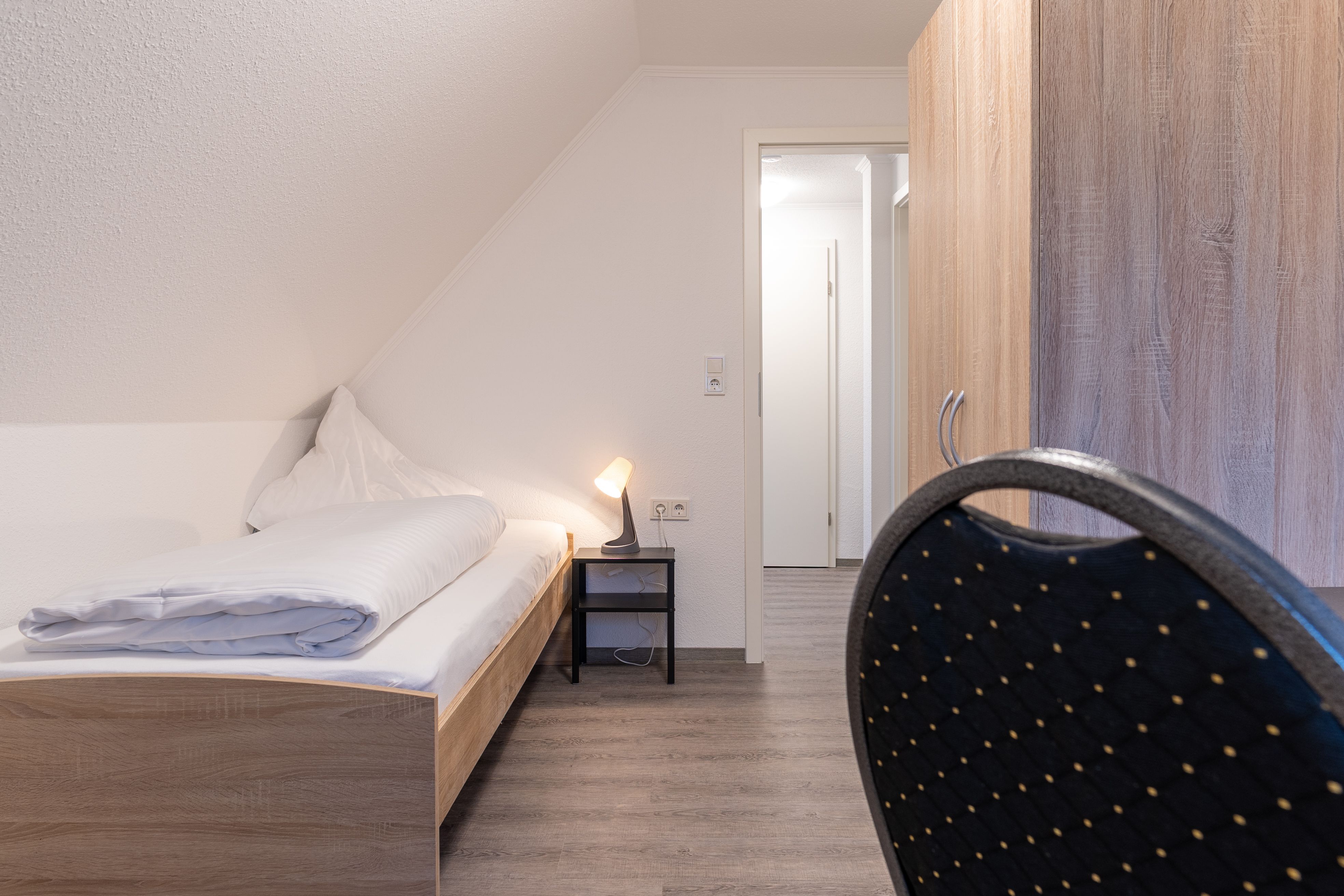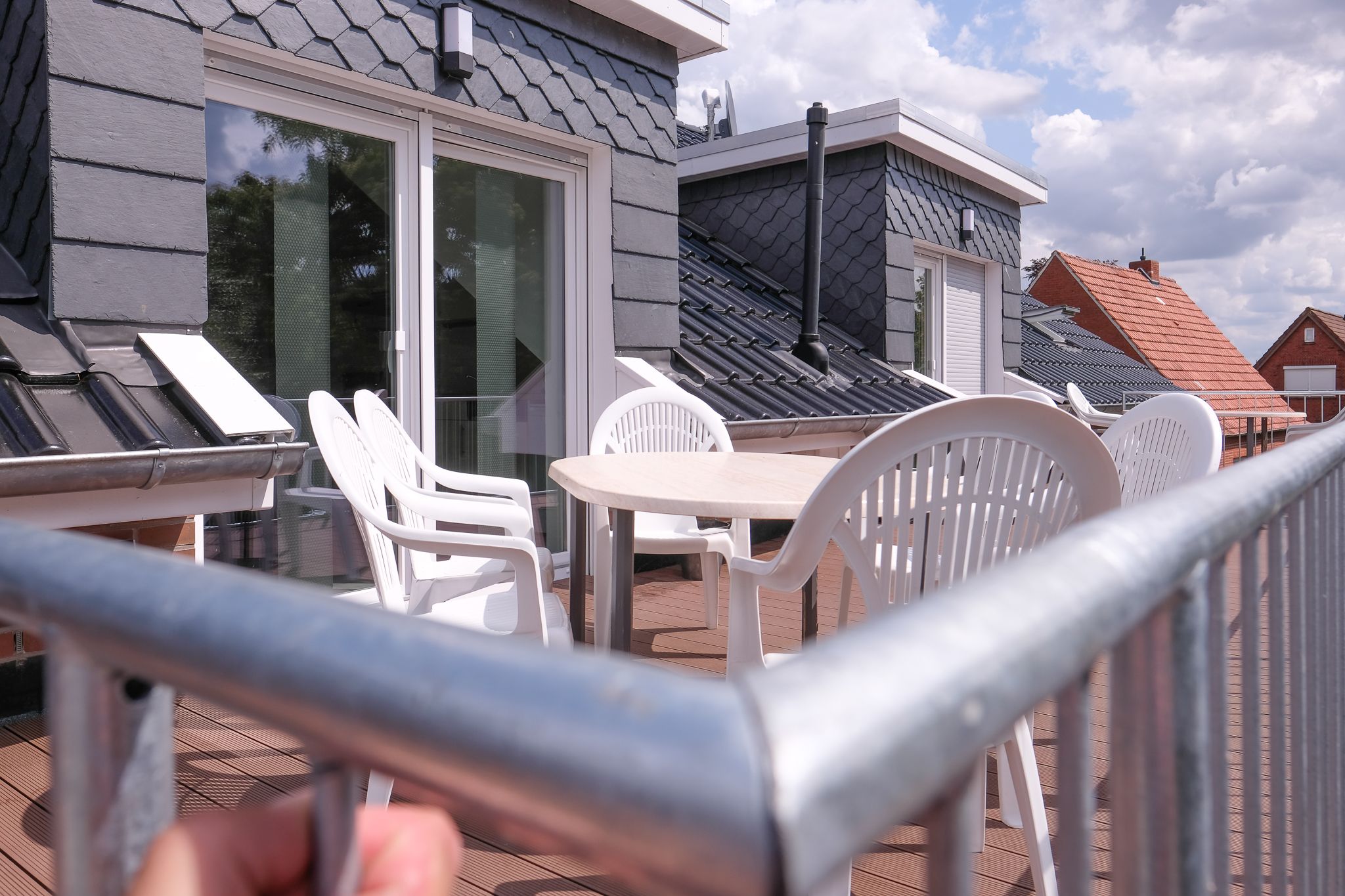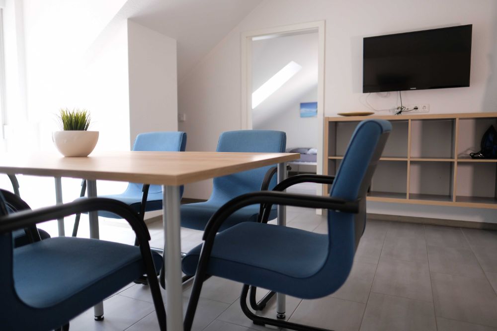 Hüttenweg, 26826 Weener für 6 Personen mit 3 Doppelzimmer, Wohnzimmer, Küche, Badezimmer und überdachtem Balkon.